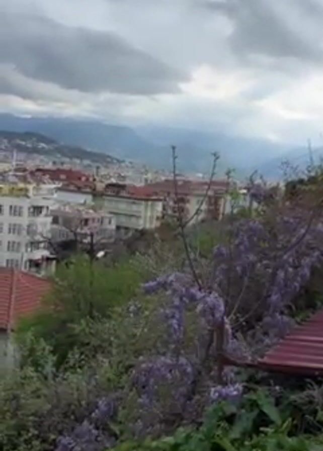 view of a city from a higher vantage point, likely a hillside. The sky is overcast with grey clouds. In the distance, mountains are visible. The middle ground consists of a cityscape with various buildings, many with red-tiled roofs, and some taller apartment buildings. The foreground is filled with lush greenery, including flowering bushes with purple blossoms. The camera focuses primarily on the purple flowers, and the buildings and landscape become the backdrop. There is no visible human presence in the video.