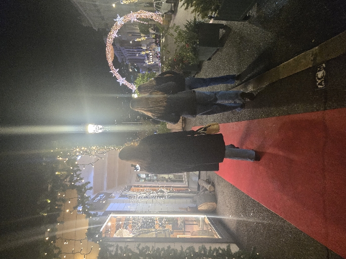 A nighttime street scene in the city of Monaco, Monaco, shows three individuals walking away from the camera along a festively decorated urban pathway
