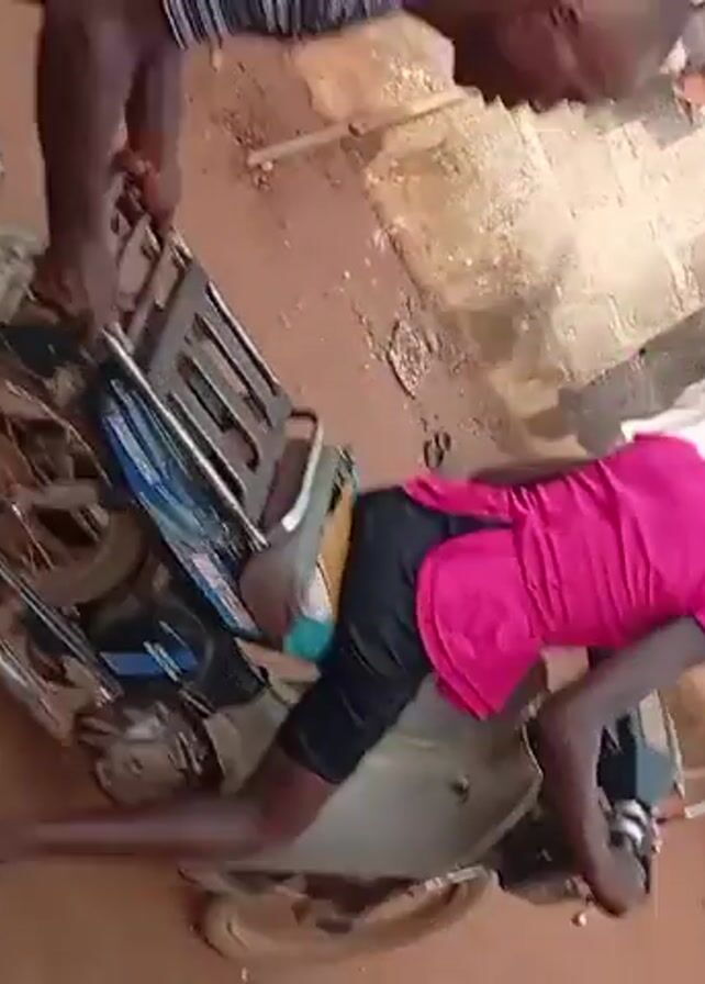 young woman wearing a pink shirt and black shorts, seemingly trying to repair a motorcycle outside. She is bent over the engine area. Another person, presumably a man, wearing a patterned shirt and black pants, joins her and appears to be helping with the repair. The motorcycle is a Yamaha MATE80. The scene takes place in an outdoor area with a tiled floor and brick walls, possibly a courtyard. There are other items scattered around, including clothing, sandals, and a small stick.