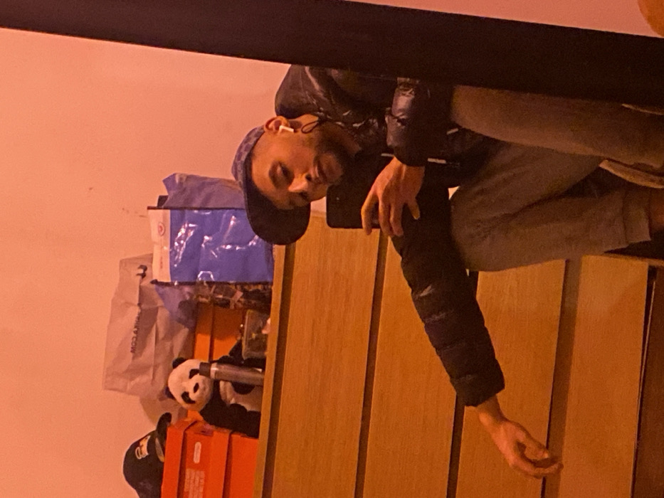 A man with a black cap and puffer jacket is leaning towards the camera while holding a phone. He is wearing wireless earbuds. Behind him is a cabinet and some items. These items include orange boxes, a Panda teddy, and various bags, one of which appears to have writing on it. The scene is cast in a warm, orange light.
