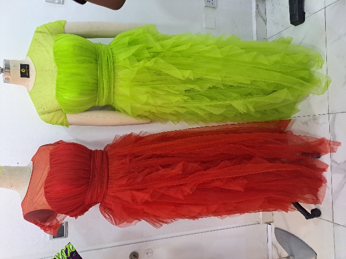 The scene depicts an interior space, specified as being in Moba, Nigeria. Two full-length dresses are displayed on headless, armless mannequins against a plain white wall. The mannequin on the left displays a red dress, featuring a sheer short-sleeved upper bodice, a ruched strapless-style main bodice with a gathered waistband, and a voluminous, floor-length skirt composed of tiered and ruffled tulle. The mannequin on the right displays a lime green dress, similarly constructed with a sheer short-sleeved upper bodice, a ruched strapless-style main bodice with a gathered waistband, and a voluminous, floor-length skirt of tiered and ruffled tulle. Both mannequins have light-colored, fabric-covered torsos; the right mannequin possesses a silver neck cap with a dark label. The floor is tiled in white with grey marble-like veining. A dark rectangular wall fixture and a partial segment of colorful patterned fabric are visible on the upper left wall. A white electrical outlet with two dark receptacles is mounted on the right wall. A metallic mannequin stand base and a dark, unidentified object rest on the floor. No individuals are explicitly present in the frame, although a dark arm or shoulder is partially visible on the far right edge.