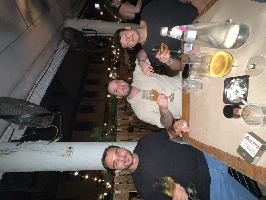 Three men are seated around a wooden table in an outdoor setting. The table holds wine glasses, a water bottle, and an ashtray. One man wears a black shirt and blue jeans, another a black shirt, and the third a beige shirt. Two of the men are holding glasses of wine. Cigarettes are present near two of the men. The background shows a building, string lights, and fans.