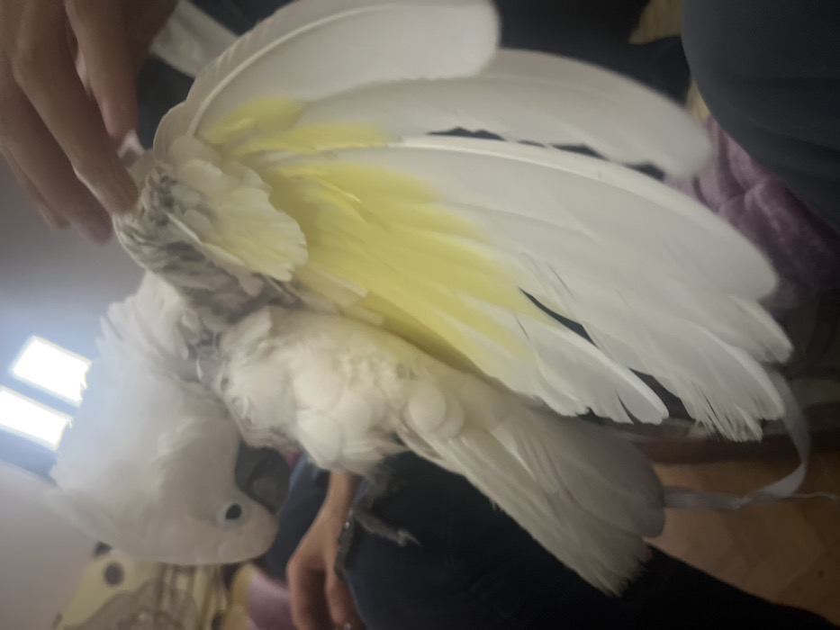 - "A white cockatoo-type bird is depicted in an indoor setting, positioned on what appears to be a person's lap" by FM-L726j2, licensed under CC BY 4.0