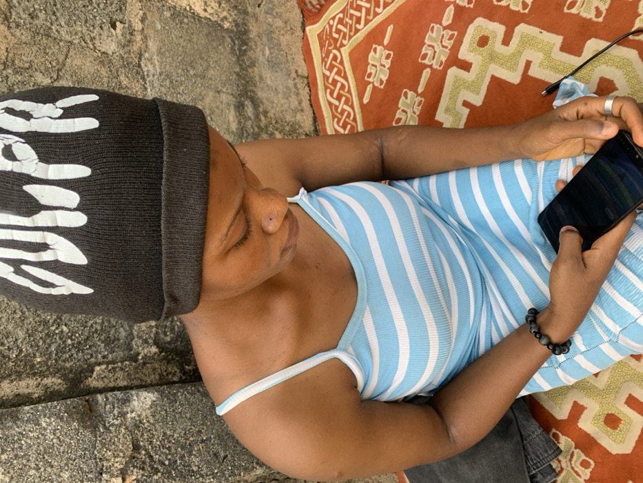 - "A young adult female, viewed from an elevated angle, is seated on an orange patterned mat with her head tilted downwards, focused on a black smartphone held in both hands" by FM-jZdn63, licensed under CC BY 4.0