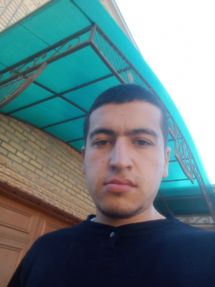 An upward-angled close-up selfie shows a male individual, appearing in his late teens or twenties, centered in the frame. He has short dark hair, dark eyes, prominent eyebrows forming a unibrow, and light stubble on his chin and jawline. He wears a dark blue or black collared shirt with two visible silver buttons on the placket. His gaze is directed forward, meeting the camera. The background behind the subject's left shoulder features a wall constructed of light beige or tan bricks. Below the brickwork, a horizontal decorative wooden panel with carved relief patterns is visible. A turquoise-colored translucent canopy or awning extends diagonally across the upper portion of the frame, supported by a dark metal frame with ornamental scrollwork visible on the right side. A bright, light-colored sky is visible above the canopy on the upper right. The scene is located in Kasan, Uzbekistan.