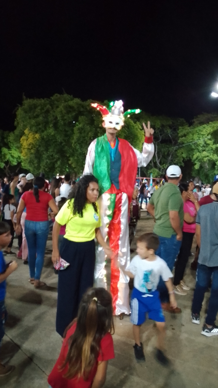 At an outdoor event at night, a stilt walker in a colorful costume and mask gestures a peace sign, surrounded by a crowd. The stilt walker's outfit includes green, red, and white sections. A woman in a yellow shirt stands nearby, while a young boy in a white shirt and blue shorts appears to be dancing. Other people, including a child in a red shirt and adults in casual clothing, are also present. Trees are visible in the background, illuminated by lights.