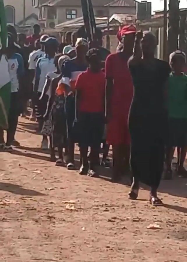 A group of people, mostly adults and children, are walking in a line on a dirt road. They are diverse in appearance and clothing, with some wearing red, black, green, and blue outfits. One person in a red dress appears to be leading and gesturing with her hand. The group is carrying a black flag and a flag with green and white on it. There is a church building with a cross visible in the background, along with houses and palm trees. The scene is brightly lit, suggesting it is daytime.