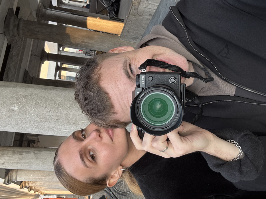 A male and female subject are captured in a selfie-style photograph within the colonnade of the Historium Bruges building, located on Markt square in Bruges, Belgium. The male subject, positioned on the right, partially obscures his face with a black Fujifilm X-T5 mirrorless camera, equipped with a lens, a green-tinted filter, and a lens hood. His visible right eye is wide, and a wide smile is present. He has short, wavy brown hair and wears a light brown hooded sweatshirt underneath a black zippered jacket, which features a subtle dark logo on the chest. A silver-colored chain bracelet adorns his left wrist, and a plain silver band ring is on his left ring finger. The female subject, visible on the left, has light brown hair pulled back into a ponytail and wears a dark, possibly black, long-sleeved top. She has a small silver hoop earring in her visible left ear. She leans her head slightly against the male subject, looking directly towards the camera with a neutral expression. The background consists of a series of tall, grey, classical-style stone columns forming a colonnade with visible archways behind them. Distant sunlight illuminates some of the columns and elements beyond. On the far left, a portion of a bicycle wheel is visible. Further in the background, behind the columns, faint outlines of tables, chairs, and other individuals suggest a public, outdoor environment.