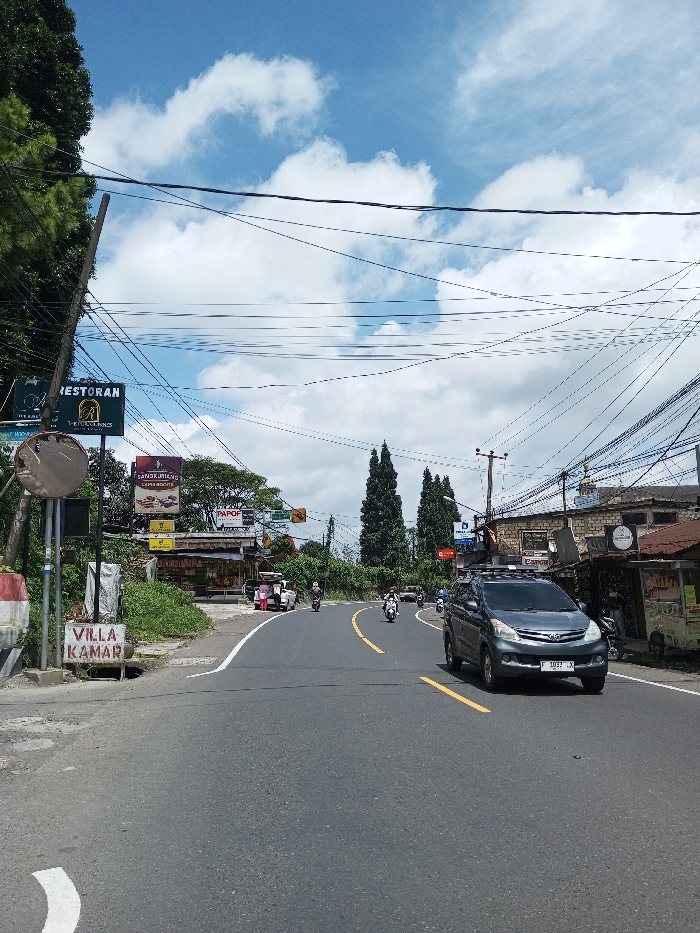 The image depicts a daytime street scene in the city of Boommlog, Bhutan, under a blue sky with scattered white cumulus clouds. A two-lane asphalt road, marked with double yellow center lines and a white solid shoulder line, occupies the foreground and midground, curving gently to the right. Numerous overhead power and communication lines crisscross the sky, connected to multiple utility poles visible on both sides of the road. On the left side of the road, a dense mass of green foliage borders the street, partially obscuring a utility pole. A damaged circular convex traffic mirror is mounted on a pole with a red and white striped base. Beneath it, a white sign on the ground reads "VILLA KAMAR." Further back, several commercial signs are visible, including a prominent black sign stating "RESTORAN" and smaller signs advertising "SARAPAN KUNINGAN," "SUPER BOGOR," and "PAPOF." These signs front low-rise buildings with corrugated metal roofs, suggesting commercial establishments. On the right side of the road, a dark grey Toyota Avanza equipped with a roof rack is in motion, traveling towards the viewer. Its front license plate displays "B 1833 JX." Behind the vehicle, a row of multi-story buildings constructed from brick and stone line the street, featuring various signs, including one for "Canon." One building possesses a distinctive dome-like structure on its roof. A white scooter is parked near a smaller, single-story roadside stall. In the distance, several motorcycles and at least one additional car are visible on the road, indicating ongoing traffic. Multiple individuals are visible on the motorcycles, wearing helmets, and other figures are present near the roadside structures.