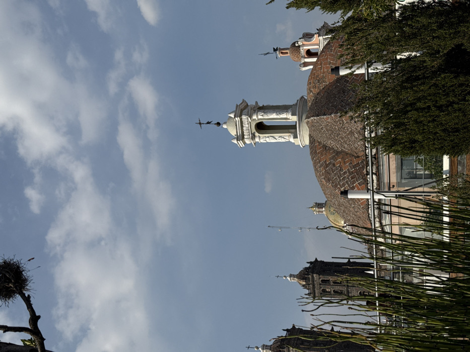 The image displays an elevated, panoramic view of the Historic Center of Puebla, Mexico, characterized by colonial religious architecture under a bright, partly cloudy blue sky. In the upper left corner, a bare tree branch with a visible bird's nest is present. The foreground, from the lower left to the mid-left, contains tall, thin green plant stalks, possibly a variety of reed. The lower right foreground features dense, dark green evergreen shrubs. A metal railing is partially visible horizontally below the central structures. The midground and background are dominated by a cluster of building domes and towers. The most prominent structure is a large, reddish-brown tiled dome in the center-right, topped by an elaborate white Baroque-style lantern. This lantern features multiple tiers, arched openings, sculpted figures, a smaller white dome, and a black cross finial. To the immediate right of this main dome, a smaller, reddish-pink domed structure with a white base and another finial is partially visible. Below the main tiled dome, a light-colored building wall with a window and two white vent pipes is evident. To the left of the prominent main dome, a golden-colored dome is visible in the distance. Further to the left, two distinct dark stone bell towers, each with multiple levels, arched openings, a dome, and a cross, rise above other structures; the left-most tower is partially obscured by vegetation. Several thin, white antenna-like structures are also visible in the mid-distance, between the golden dome and the left bell tower. No individuals or active interactions are observed within the scene. The lighting suggests daytime conditions.