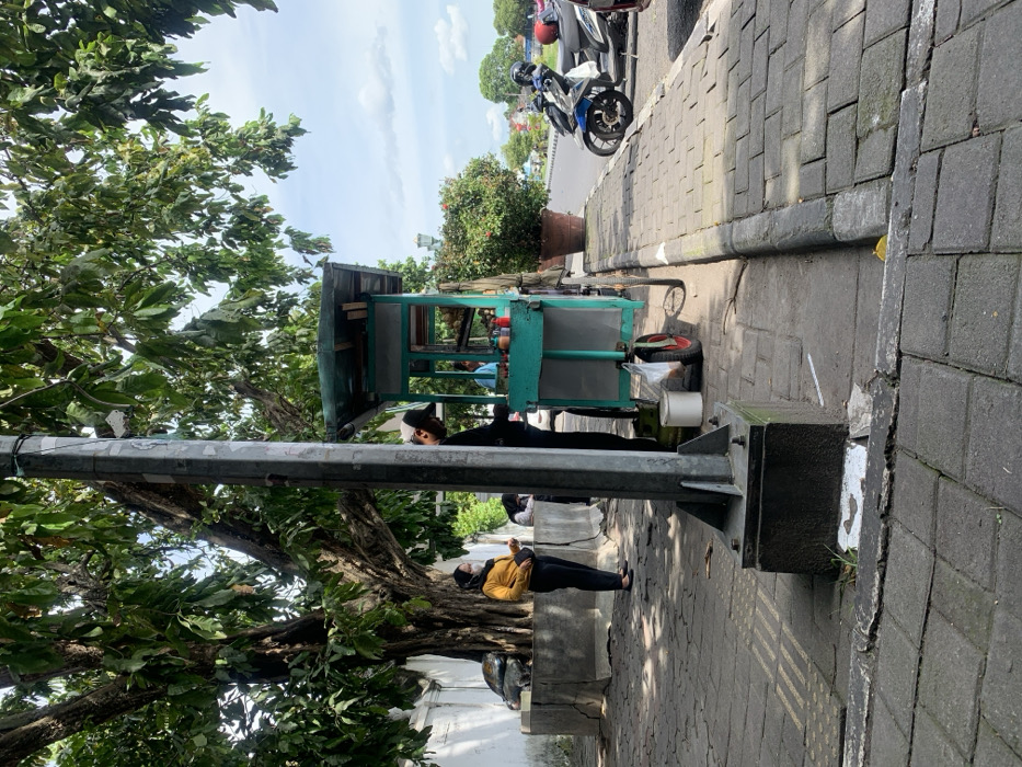 A street scene shows a food cart near a leafy tree. A vendor wearing a white cap stands near the cart. Another person in a yellow shirt is seated on a concrete bench using a phone. A utility pole stands beside the bench. The sidewalk is paved with stone blocks. Motorbikes are parked along the curb in the distance. The sky is overcast.