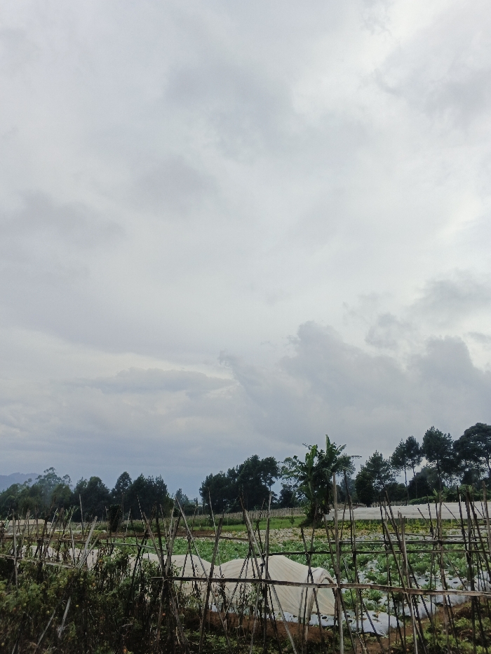 The image displays an agricultural landscape in São Félix do Xingu, Brazil, under an overcast sky. The upper two-thirds of the frame are filled with a dense, light grey cloud cover. A faint, hazy line of distant mountains or hills is visible on the far-left horizon, partially obscured by closer vegetation. A dark green treeline, composed of various tree species including conifers on the right, extends across the mid-ground. A distinct banana-like plant with large leaves stands slightly in front of the main treeline in the center-right. The foreground features an active cultivated field. A rudimentary trellising or fencing system made of thin, light brown wooden poles, some arranged in "X" shapes, traverses horizontally across the lower third of the image. Behind this structure, multiple low, arched structures covered with white plastic sheeting serve as row covers for crops. Green foliage from various cultivated plants is visible on the dark brown soil between these covered sections and the trellising. No individuals are present in the scene.