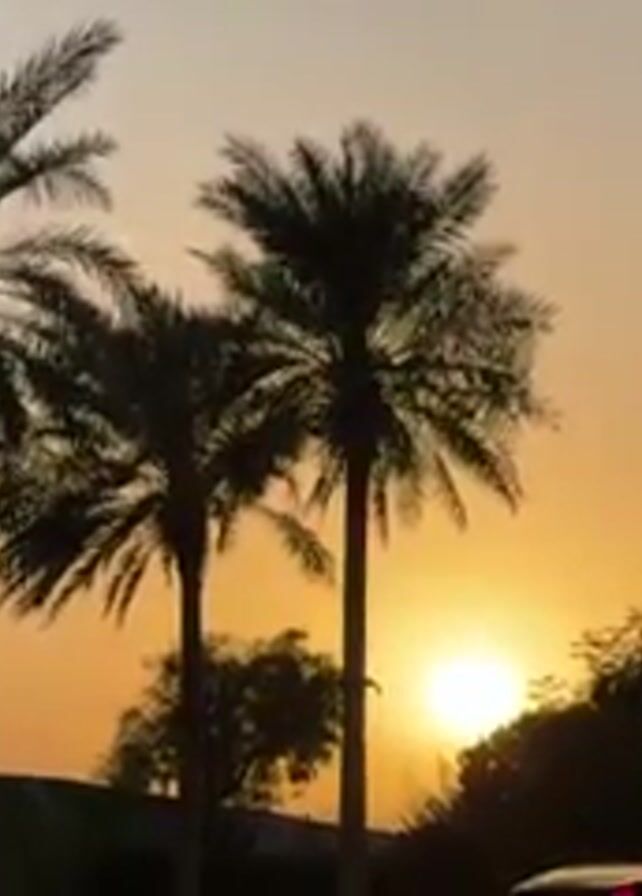 sunset in a tropical area, with palm trees silhouetted against the orange sky. There are other trees and a light post visible as well. A car drives by in the foreground. In the distance, the faint outline of buildings can be seen.