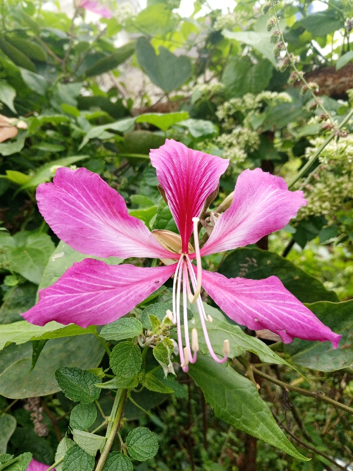 A single, large, five-petaled flower, exhibiting shades from vibrant magenta in its upper petal and central structure to lighter pink with distinct darker venation on its lateral and lower petals, occupies the center of the frame. Five elongated, pale pink stamens with light brown anthers extend from the flower's core. A small, black ant is positioned on the surface of the lower-left pink petal. The background consists of dense, out-of-focus green foliage, including various leaf shapes and clusters of small, light-colored blooms or buds in the upper right. The scene is illuminated by diffused natural light and is located in Catarman, Philippines.