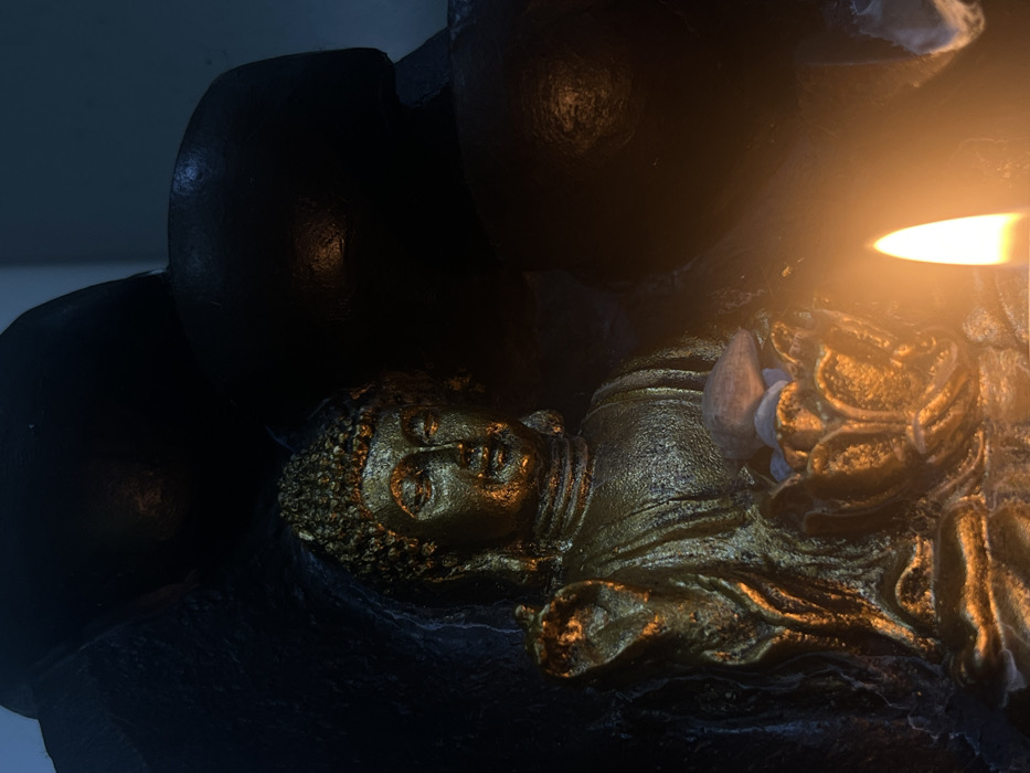 A golden-colored Buddha statue is prominently featured, seated and depicted with textured details on its robes and curled hair. The figure's right hand is raised in a gesture, while the left hand holds a lotus-shaped bowl containing several small, light-colored stones or pebbles. The statue is illuminated by the warm, orange-yellow flame of an upright candle positioned in the lower right foreground. The background consists of dark, textured, sculpted forms, appearing black or very dark grey, with subtle hints of a darker blue or grey surface behind them, suggesting an indoor environment. No identifiable architectural or environmental features are present in the image to determine a specific location within the city of Palma de Mallorca, Spain.