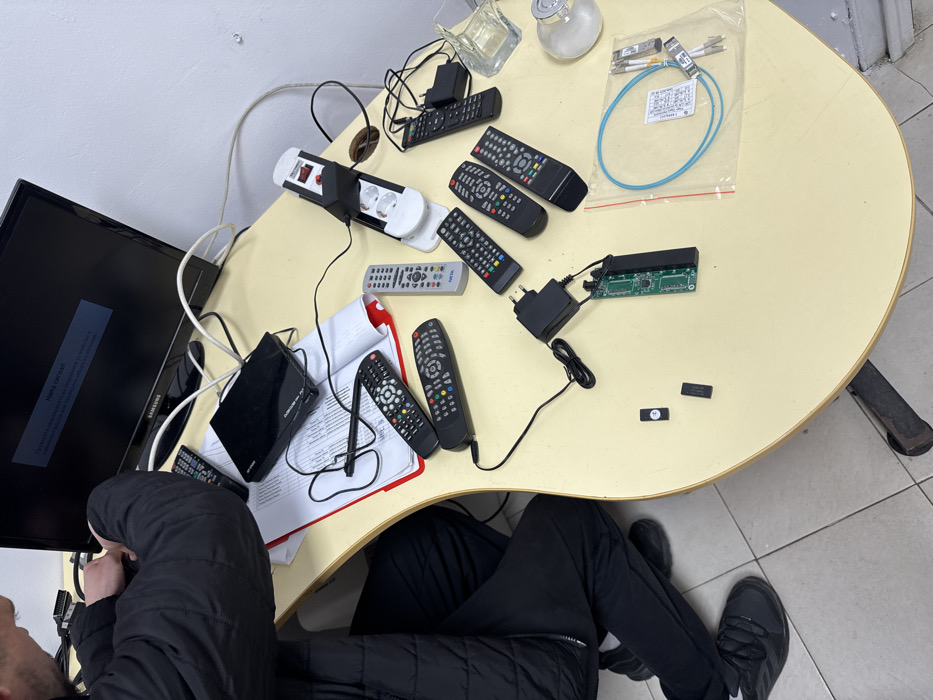 The scene is an indoor electronics workspace in Lovech, Bulgaria. A person, visible from the torso down, wearing a black puffer jacket and dark pants, is seated at a light-colored, curved desk. Their hands are engaged with cables or components at the rear of a black Samsung monitor, which displays the Cyrillic text "Няма сигнал" (No signal). On the desk, directly in front of the monitor, a black rectangular device, possibly a set-top box or media player, rests atop a stack of papers held by a red clip. Multiple television remote controls, some bearing the "NETA" brand, are scattered across the desk surface. To the right, a white horizontal power strip with two visible outlets is positioned, with a black power adapter plugged into one. Various other power adapters, charging cables, and connection wires are dispersed, including one connected to a small green circuit board partially encased in black plastic. Another smaller, exposed green circuit board lies nearby, alongside several small black, rectangular electronic components. Two clear glass containers, one appearing as a decorative bottle or decanter, are also present on the right side of the desk. In the lower right corner, a clear plastic bag contains coiled light-blue fiber optic cables and several small silver-colored connectors, likely SFP modules or similar data transmission components, with a white label visible inside the bag. The floor is covered with light-colored tiles, and the background wall is white.
