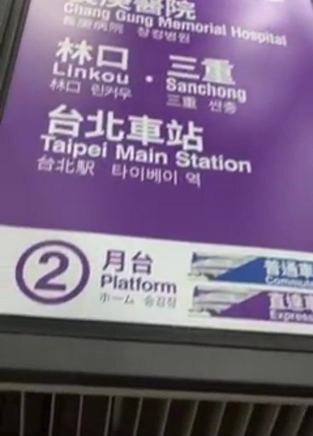 person in what appears to be a subway station. The camera starts focused on a purple sign indicating directions to Chang Gung Memorial Hospital, Linkou, Sanchong, and Taipei Main Station. It also indicates that Platform 2 is to the left. The camera pans upwards, showing a white, grid-like ceiling structure with various pipes and fixtures above. The camera continues to pan out, revealing the subway platform area. There are people with luggage visible and a large sign with arrows pointing left towards Platform 2 (going to Taipei) and right towards Platform 1 (going to Zhongli). There are also subway doors visible.