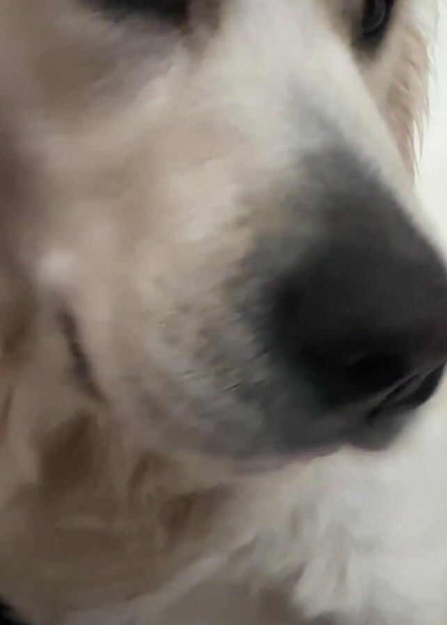 close-up of a white dog, likely a Golden Retriever. The dog is panting with its tongue hanging out and makes intermittent snorting sounds. The camera focuses on the dog's nose and mouth area. The background is blurred and appears to be an indoor setting.