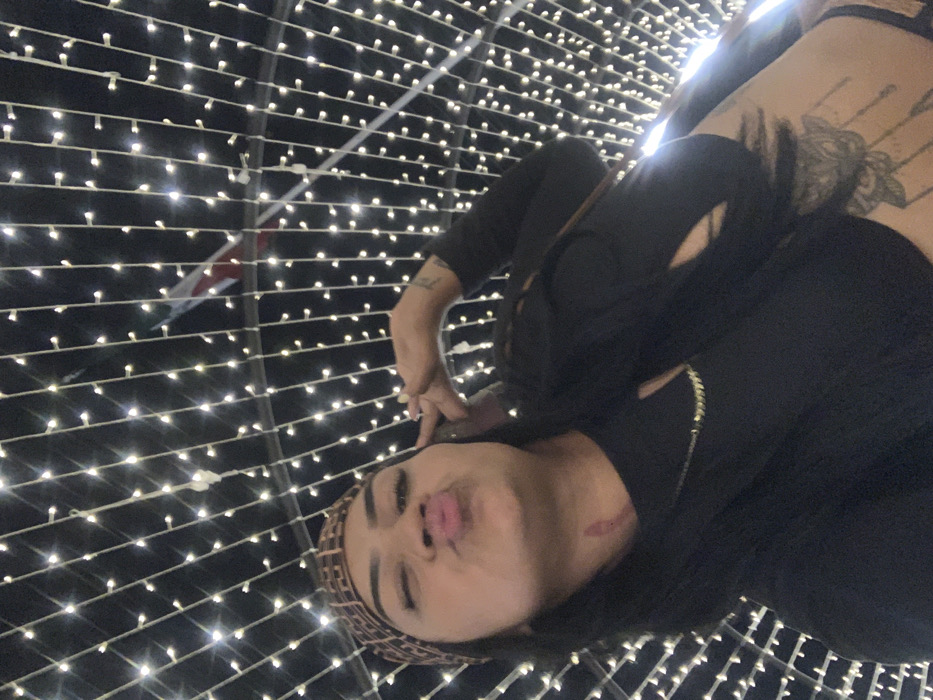 The image depicts a female individual in the foreground, positioned within an arched tunnel adorned with numerous small white string lights. The location is Pampatar, Venezuela. The subject has long, dark hair and wears a brown and tan patterned headscarf and a black long-sleeved top with cut-outs on the shoulders. Her lips are puckered in a "kiss face" expression. Her right hand is raised near her temple, with fingers extended in a gesture. A reddish mark is visible on the right side of her neck. A large, dark-inked tattoo, appearing to be a floral or dreamcatcher design, is visible on her left torso, extending from beneath her shirt. In the upper right background, a national flag, identifiable by its yellow, blue, and red horizontal stripes as the Venezuelan flag, is partially visible against a dark sky, indicating a nighttime setting.