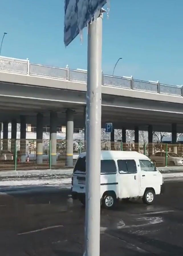 street scene on a sunny day, with snow visible on the ground and trees. A white van drives away from the camera on a wet asphalt road under a bridge. The bridge has decorative railings and lamp posts. Other cars are visible on the road. The blue sky has some clouds. A sign is partially visible on the left of the frame. A blue umbrella is visible near a snowy mailbox.