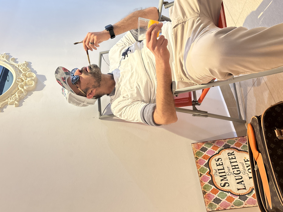 In M'Diq, Morocco, a male individual is seated in a red and grey folding canvas chair against a plain white wall. He wears a white t-shirt with a dark logo, tan trousers, a white mesh-backed baseball cap with a patterned brim, and blue-tinted sunglasses. A dark wristwatch is on his left wrist. He holds a lit cigarette in a long wooden holder with his right hand, positioned near his mouth, and a clear glass containing an orange liquid in his left hand. Above him on the wall, an ornate, cream-colored framed mirror is mounted. To his lower left, a multicolored decorative sign, bearing the text "Plant SMILES Grow LAUGHTER Harvest LOVE," rests against the wall. In front of the sign, on the tiled floor, a dark brown monogrammed bag supports an orange-handled knife with a dark blade. The scene is brightly illuminated, casting distinct shadows.