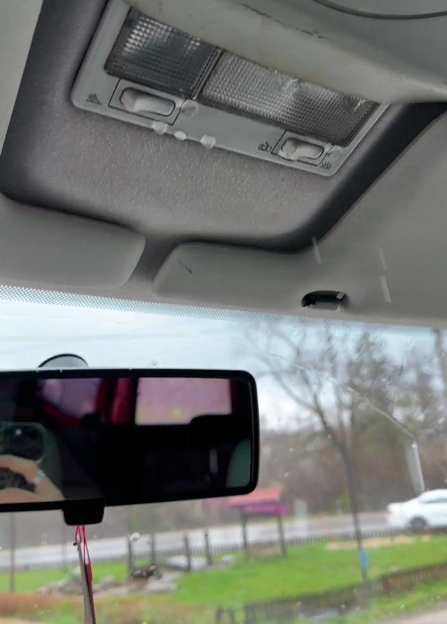 view from inside a car, looking out through the windshield. The dashboard is visible, with an air freshener hanging from the rearview mirror. Outside, it appears to be raining, and there is a park or grassy area with trees and a small structure visible. The interior car light is visible on the ceiling, along with a sunroof. The car is stationary during the clip.