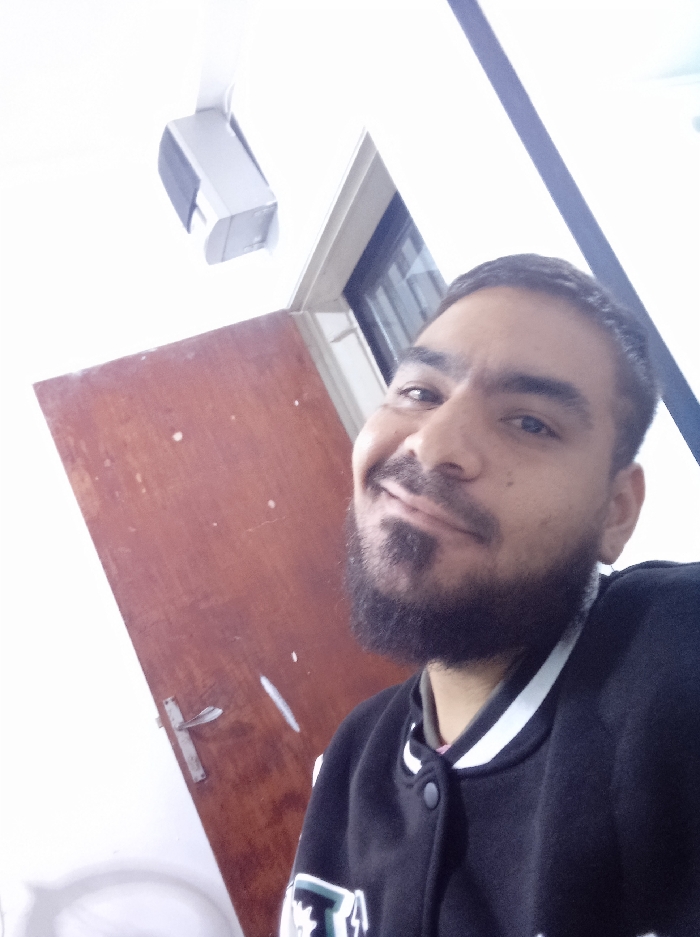 A selfie shot from a low angle captures a man with dark hair and a trimmed beard. He is smiling subtly, wearing a black varsity jacket with white trim. Behind him, a dark wooden door contrasts with the white wall. Above the door is a window and a white rectangular object, potentially an air conditioning unit. A structural element, possibly a beam, runs diagonally across the upper right corner of the frame.