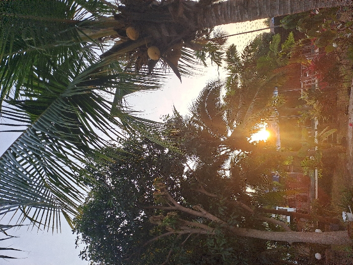 The image depicts an outdoor tropical environment in Choeng Mon, Thailand, captured during either sunrise or sunset. A strong golden-orange sun, low in the sky, is positioned centrally in the midground, creating a prominent lens flare and backlighting the scene. The foreground and midground are densely populated with various trees and vegetation. A large, light-barked tree with green foliage is prominent on the left, with two spherical white decorative lights and a white bucket visible near its base on the ground. On the right, a tall coconut palm tree, laden with several green coconuts near its crown, extends upwards and partially out of frame, its fronds silhouetted against the pale sky. Numerous other palm trees and broadleaf trees fill the central and right portions of the frame. A raised wooden platform or walkway is discernible horizontally in the midground, partially obscured by the foliage and intense light. In the background, partially hidden by the trees and lens flare, outlines of buildings are visible, including one structure with a distinct blue roof directly behind the sun. The sky transitions from a pale blue at the top to a warm yellowish-orange near the horizon. No people or overt actions are present in the scene.