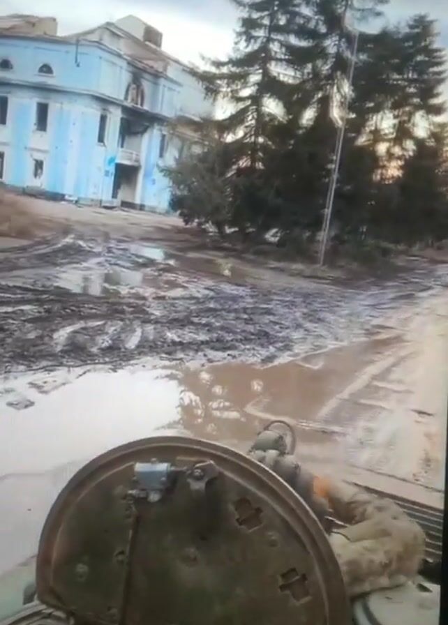 view from the top of a tank or similar military vehicle. The vehicle is on a muddy, rutted road, and the camera pans around to show a damaged, light-blue and white building. The building is two stories tall, with a white colonnade in front of it. The windows are mostly broken. There is graffiti on the building that says "Часів Яр це Україна" (Chasiv Yar is Ukraine). In the distance, a lone figure can be seen walking on the grounds near the building. Several tall evergreen trees are visible around the building. The sky is overcast. It appears to be a war zone.