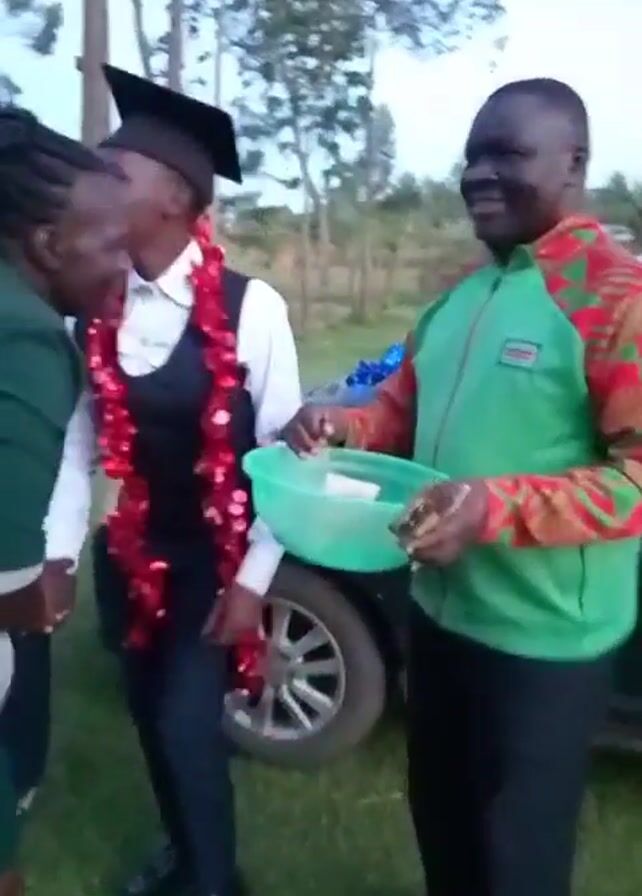 A person wearing a graduation cap, vest, dress shirt, dress pants, and shiny dress shoes stands in an outdoor setting, with a red and white lei around their neck. The person is smiling as they hug another person wearing a green dress, and also shakes hands with a man who is holding a light green bowl with white envelopes inside, and a smartphone. The man is wearing a green and red patterned jacket. A car is parked behind them, and other people can be seen in the background, including one man who is wearing glasses and a sweater vest. The setting appears to be outdoors, with a lawn, trees, and possibly a rural background.