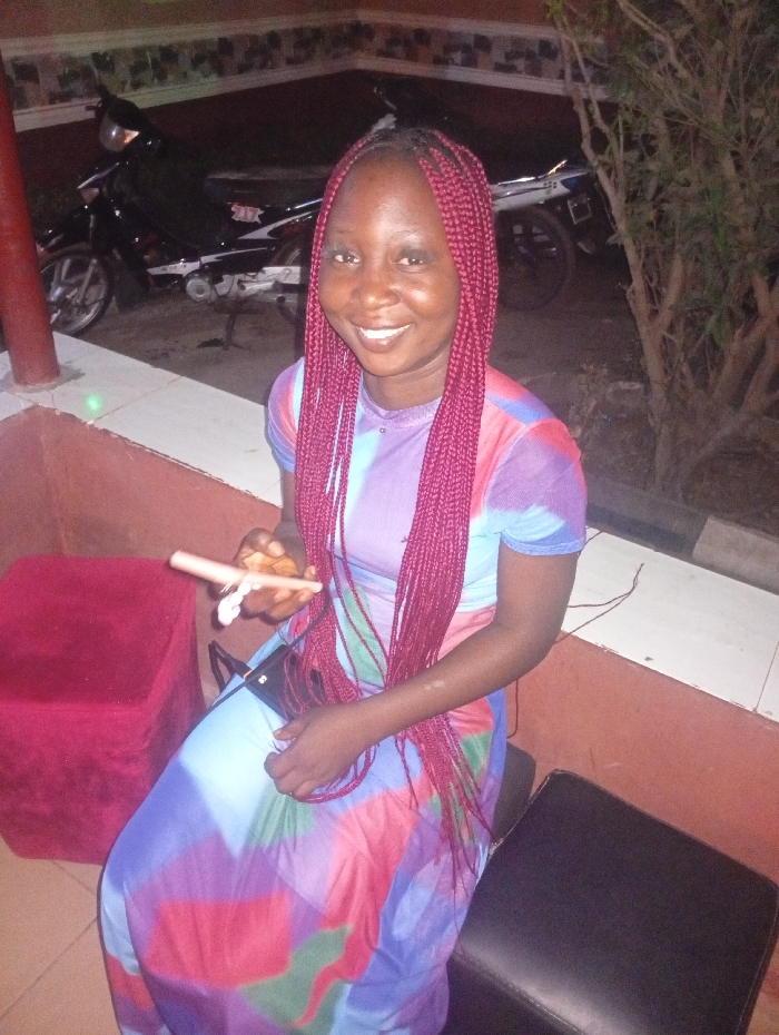 A woman with maroon braids and a bright smile sits outdoors. She's wearing a colorful, flowing dress with blue, purple, red, and green sections. In her hand, she holds a rolled item and a white string. A red ottoman is to her left, and a black cushioned seat is to her right. In the background, two motorbikes are parked. Green foliage flanks the right side of the image. A red pole stands on the left.