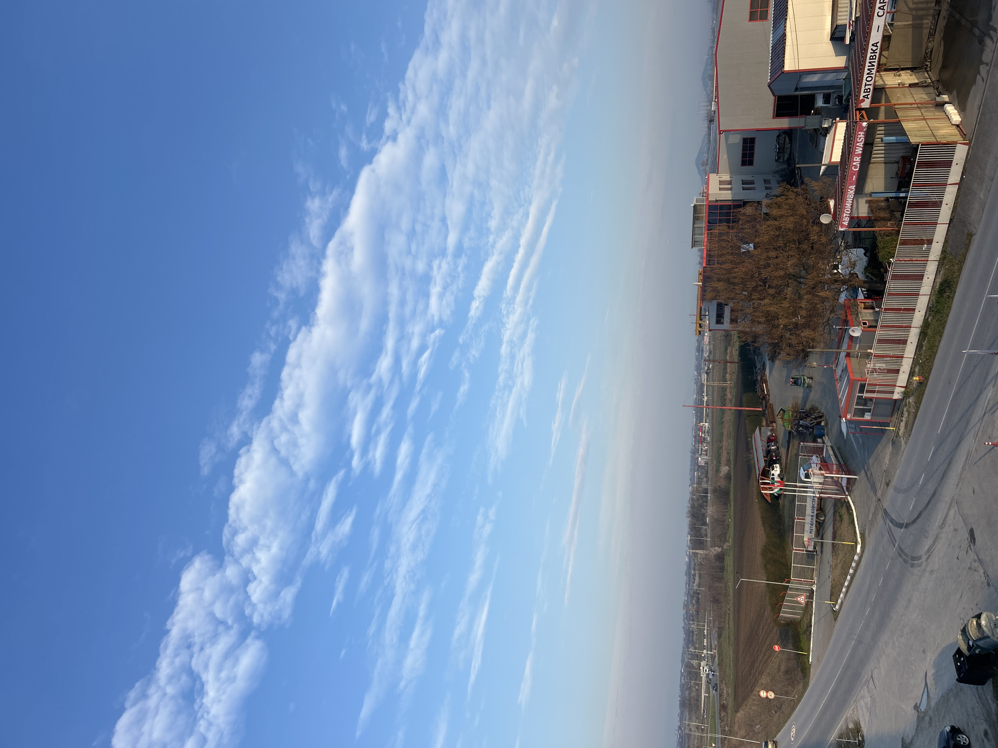 An elevated, expansive view captures a commercial and agricultural landscape in Krumovo, Bulgaria, under a clear blue sky patterned with elongated white stratocumulus clouds. The scene is illuminated by natural light, suggesting either morning or late afternoon. In the foreground, a multi-lane asphalt road curves from the lower left towards the mid-left, exhibiting tire marks on its surface. To the right of the road, a "STOP" sign (red octagon with white text) and two white circular regulatory signs (one with "50" in black) are visible. A dark-colored vehicle, partially obscured, is positioned near two dark trash receptacles in the lower-left corner. The midground features a commercial complex, accessible from the road and delineated by a white fence with red vertical bars. A small red-roofed gatehouse or office stands near the entrance. Within this complex, multiple signs in Bulgarian and English, specifically "АВТОМИВКА – CAR WASH," identify a car wash facility. Several grey industrial buildings with red accents (roofs, window frames) are present, including a larger multi-story structure with numerous windows and a lower building with a red gable roof and a large bay opening. A prominent deciduous tree with sparse brown foliage stands centrally within the complex. Several vehicles, including a white box truck labeled "ВАЛ - МЕТАЛНИ КОНСТРУКЦИИ" in Cyrillic and a blue forklift, are visible within the fenced area, amidst scattered materials. Beyond the immediate commercial zone, the background transitions into vast, cultivated brown fields stretching towards the horizon. In the distance, a line of indistinct buildings and structures, possibly residential or industrial, is visible through a slight atmospheric haze. Faint outlines of mountains can be discerned on the distant horizon, particularly towards the right. Multiple utility poles and a circular intersection with moving vehicles are also visible in the far-left background. No discernible individuals are present or engaged in specific actions within the frame.
