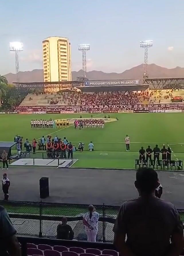 soccer stadium during the national anthem. Two soccer teams are standing on the green field, facing the audience. People fill the stands behind them, while a small crowd is visible behind a fence, closer to the camera. A large tower is visible in the background. The sky is light blue. The word PEPSI appears on an advertising billboard along the side of the field. Some people in the front are standing while others are seated. Loud music plays in the background.