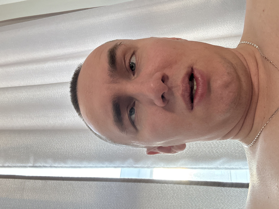 A man's face is angled downward, featuring close-cropped hair, prominent eyebrows, and fair skin