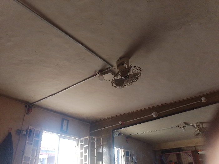 A low-angle shot shows a cluttered room. The ceiling is off-white and features a metal track with attached lights and a vintage-style ceiling fan. Another similar track with lights runs along the far wall. The room is illuminated by natural light streaming through a window with a white frame and multiple panes. Shelving units flank the window, and a mirror reflects the scene, adding depth and complexity to the composition.