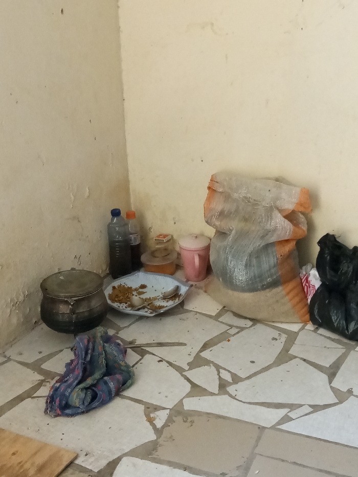 The image displays an interior corner of a room located in Tudun Wada, Nigeria. The walls are light beige, exhibiting noticeable peeling paint and discoloration, particularly along the lower sections. The floor is composed of irregularly shaped, light-colored tiles separated by darker grout lines. In the lower-left quadrant, a lidded, dark-toned metallic pot rests on the tiled floor. To its right, against the wall, stand two plastic bottles: one clear with a blue cap containing a dark liquid, and another amber-colored bottle with an orange cap. Centrally positioned on the floor is a white, leaf-shaped plate with a blue rim, containing yellowish-brown food residue and a silver spoon. Behind this plate, against the wall, are two small containers: a clear one with a yellowish lid, and a pink plastic lidded cup. In the lower-right section, a large, semi-transparent woven sack with orange vertical stripes is filled with dark material. Adjacent to it are two black plastic bags, one appearing to contain white material. A crumpled, multi-colored fabric item, primarily blue, and a metallic spoon are lying on the tiled floor in the foreground. No individuals are present in the scene.