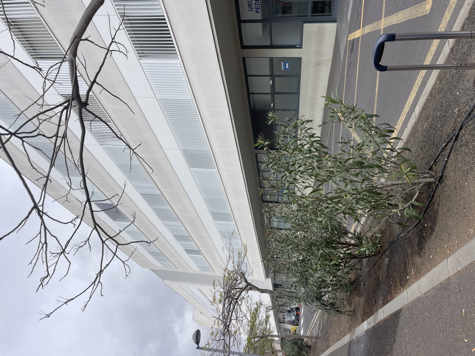 exterior of a modern, white building with large windows and a flat roof. The building is situated in Arona, Spain, at coordinates 28.069, -16.705. The building has a sign that reads "URG PEDI" indicating a pediatric emergency room. There are several bare-branched trees in the foreground and a line of green shrubs growing along the sidewalk. A single, black metal luggage handle is resting upright on the sidewalk. A black streetlamp stands near the sidewalk and a white car is visible to the left. The sidewalk is made of grey concrete and is bordered by a curb. The pavement in front of the building is grey asphalt with yellow lines painted on it. The sky is overcast and grey. The image was taken during the day.