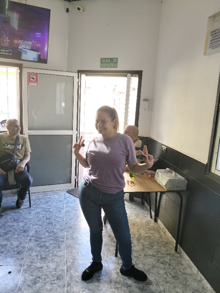 A young woman in a purple t-shirt and jeans stands in front of an open doorway, making peace signs with both hands. Two men sit in chairs on the left side, and another man is seated at a table on the right. A television is mounted high on the wall, and a sign reading "Salida de Emergencia" (Emergency Exit) is visible above the door. The floor is tiled, and the walls are white, with a dark band along the right side.