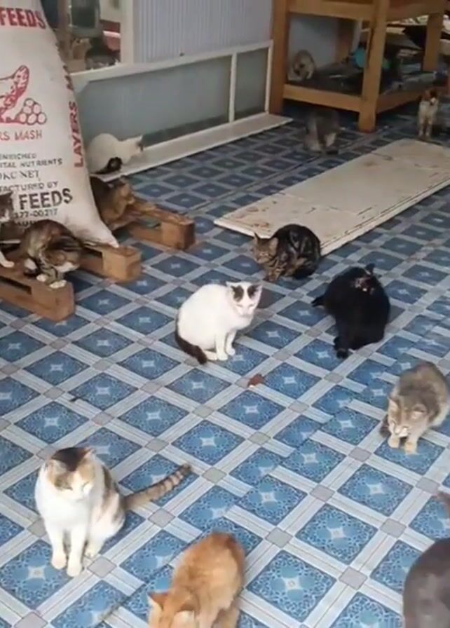 room and then a screened-in area filled with cats. The room has a light blue tiled floor with a repeating pattern and a bag of animal feed in one corner. The cats are of various colors and sizes and are either sitting, lying down, or standing. The screened-in area has a sandy or dirt floor and contains even more cats.