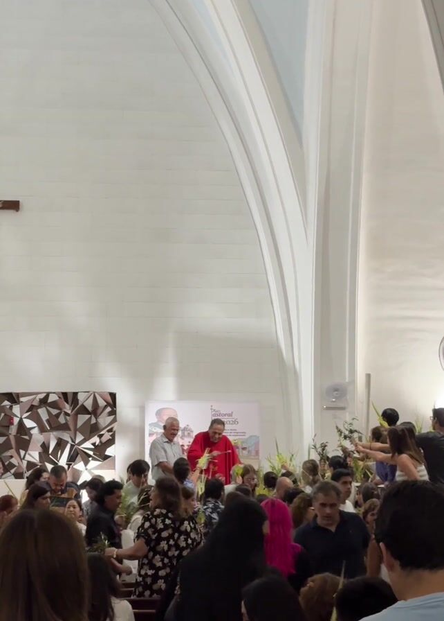 Palm Sunday service inside a church. A priest in a red robe and another man stand on a platform, blessing palms held by people in the pews. The church has white walls and high, arched ceilings. The congregation includes people of various ages, some holding palm branches aloft. A banner with images and text is visible behind the speakers. A cross is mounted high on the wall to the left. The scene is bright and the atmosphere appears reverent.