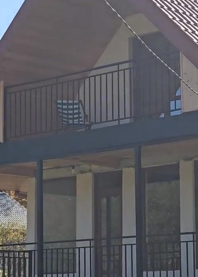two-story house with a brown metal roof. The top floor has a balcony with a black railing and a wooden chair on it. The lower floor also has a balcony with a black railing. The house is surrounded by trees and the sky is blue.