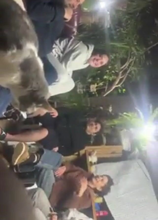 A group of six people are sitting outside at night, seemingly in a backyard or patio area. They appear to be conversing and laughing. A gray and white cat is in the foreground. The area is illuminated by overhead lighting, and there are plants visible in the background. Some of the people are seated on chairs while others are on the ground.