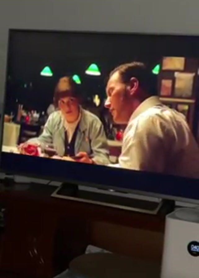 The video depicts a television set showing a scene from a film or TV show. The scene appears to take place inside a restaurant with dark lighting, accented by green overhead lamps. Two people, a younger person and an older man, are seated at a table. The younger person, possibly a child, is wearing a light-colored shirt or jacket and looks to be explaining something, gesticulating with their hands. The older man, in a white dress shirt, seems to be listening intently. The audio is primarily dialogue between the characters on screen. The TV is sitting on a wooden cabinet, and to the side of the cabinet is an air purifier.