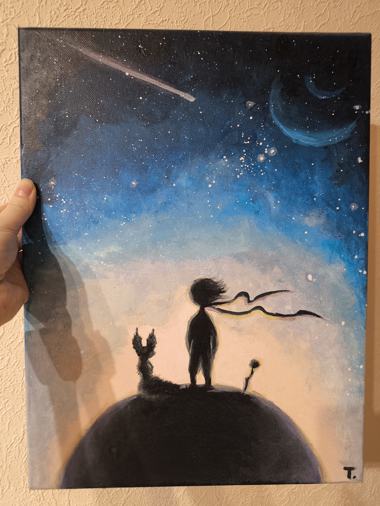 A rectangular canvas painting, oriented vertically, is held by a left human hand against a textured, light beige wall. The thumb is visible on the upper left edge, and fingers cast a subtle shadow on the wall. The painting depicts a night sky scene. The upper portion of the canvas shows a dark blue to light blue gradient, densely populated with white speckles representing stars. A bright white diagonal streak, indicative of a shooting star or comet, extends from the upper left quadrant towards the center. In the upper right quadrant, two faint, light blue crescent shapes are present, suggesting moons. Below the celestial scene, a horizontal band of pastel colors, transitioning from light blue to pink and peach, forms a horizon line. In the foreground, a large, dark, spherical landmass, possibly a small planet or asteroid, occupies the lower third of the canvas. On this dark sphere, three dark silhouettes are visible: a small human-like figure, resembling The Little Prince, stands facing away from the viewer, positioned slightly left of center. This figure features flowing hair or a scarf extending to the right, suggesting movement. To the left of this figure, a smaller, low-lying silhouette, resembling a fox, is crouched. To the right of the human-like figure, a thin, upright silhouette of a stemmed plant with a small bloom at its top, resembling a rose, is depicted. A dark 'T.' is visible as a signature in the bottom right corner of the canvas. The background wall exhibits a stippled or "orange peel" texture. The specific location within Riga, Latvia, cannot be determined from the visual information provided.