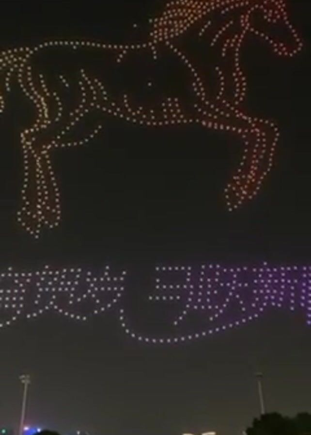 drone light show in an urban environment. In the night sky, a horse figure comprised of numerous lit drones glows with orange and yellow hues. Below, another formation of drones creates a message in purple and white lights. Several individuals can be seen on stairs in the foreground, presumably watching the display. The urban backdrop includes buildings and greenery, indicating a city park or similar public space. A single loud boom, presumably from a firework, can be heard in the middle of the video.