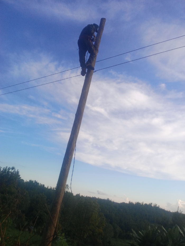 A solitary individual is depicted ascending a wooden utility pole in Karuri, Kenya