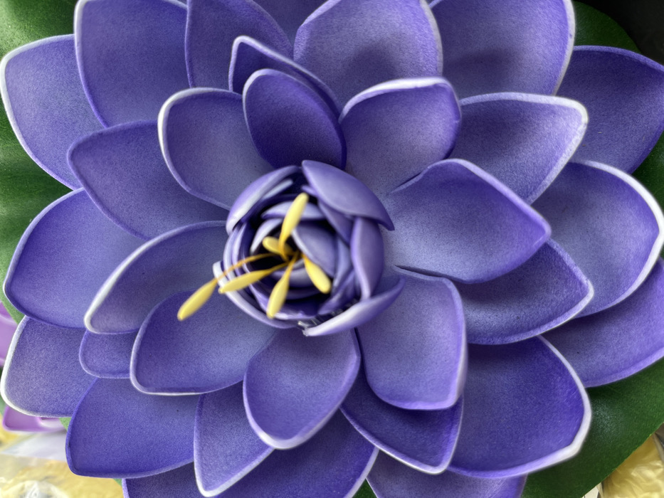 This image presents a close-up, top-down view of an artificial purple flower, located in Sofia, Bulgaria