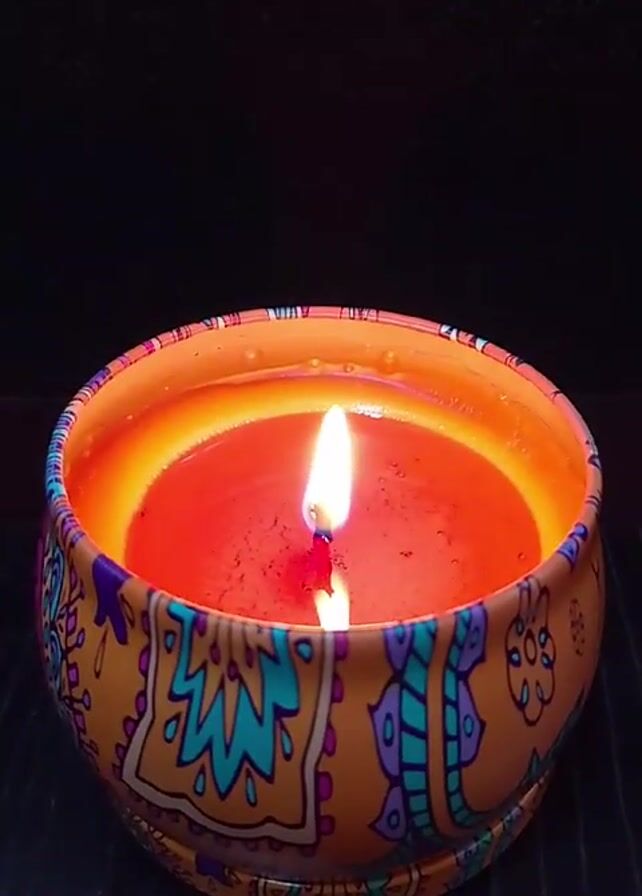 lit candle in a patterned, circular container sitting on a dark surface. The candle is filled with an orange substance, and a bright flame flickers at the wick's center, reflecting on the smooth surface of the wax. The container features a yellow background with blue and purple paisley-like designs. The backdrop is a blurry black, creating a low-light environment.