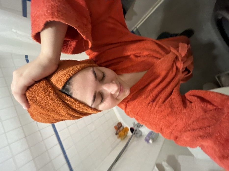 The image depicts a young adult female inside a bathroom, located in the city of Rennes, France. The subject is captured from a high-angle perspective, wearing an orange terrycloth bathrobe and an orange towel wrapped around her head in a turban style. Her right hand rests on top of the head towel. Her head is tilted downwards, eyes are closed, and a subtle smile is visible on her face. The bathroom features white tiled walls with a single horizontal blue stripe running across. A white bathtub rim is prominent on the left, containing an assortment of bath sponges and bottles. A silver shower hose is draped on the tiled wall above the tub. The floor outside the tub area appears dark grey. Partial views of other bathroom fixtures include a white rectangular object on the far left and a dark, possibly metallic, object on the far right.