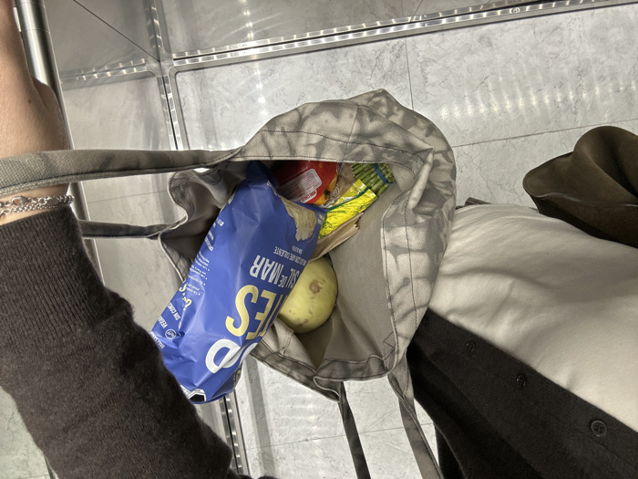 A canvas tote bag with snacks inside sits on what appears to be a garment